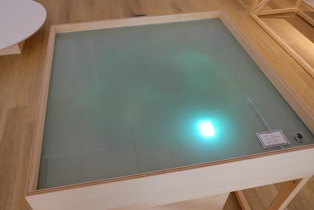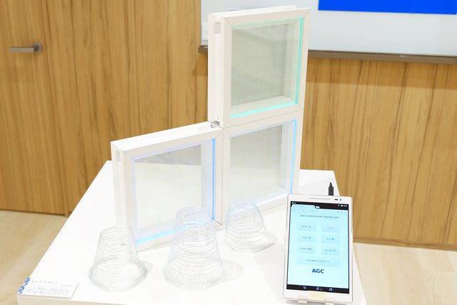 ファイナリストとして選抜された事業化を前提としたプロトタイプが会場には展示されている。その1つである「IoTガラスブロック」は、「ガラスに好みの機能を持たせ、その機能を自由に組み替えたい」というアイディアから生まれたというコンセプトモデル。ガラスに調光と面発光の機能を持たせることで、オフィスなどの空間に応じて透明度や照度を調整できるというインタラクティブなガラスウォールが構築できる。ガラススピーカーや環境データのセンシング機能などを取り入れての多機能化も想定されている。