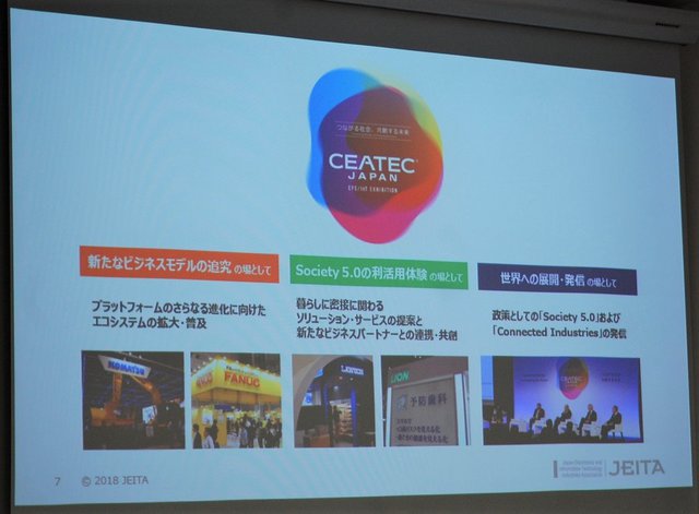柵山会長は「Society5.0の未来に向けた取り組みがますます進展していくにあたり、あらゆる分野において、IT・エレクトロニクスはこれからますます重要になる。あらゆる産業と連携し、Society5.0の実現に向けた市場創出と事業環境整備により重点的に取り組んでいく。CEATECも来年には20周年を迎え、あらゆる産業による共創をベースにした、Society5.0の実現を目指す場として強化していく。テクノロジーを見せる展示会ではなく、テクノロジーで社会をどう変えていくのかを発信していく場として、豊かな社会を描けるよう取り組んでいく」と力を込める。