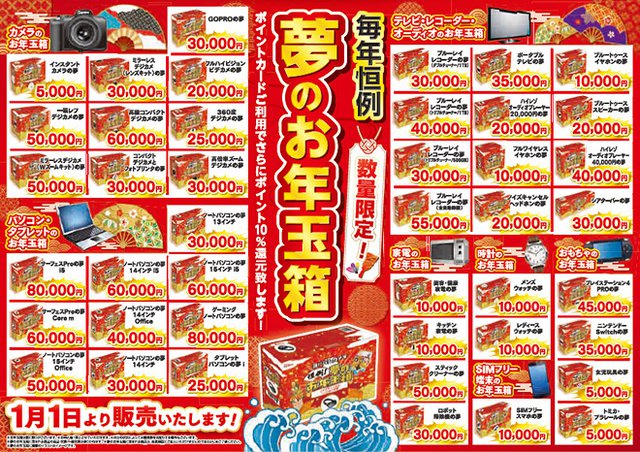 初売りでは、「2019年夢のお年玉箱」を8:30から数量限定で販売する。「ブルーレイレコーダーの夢」「ポータブルテレビの夢」「ハイレゾオーディオプレーヤーの夢」「SIMフリースマホの夢」など、様々な「夢のお年玉箱」を販売する。10%ポイント還元も行われる。