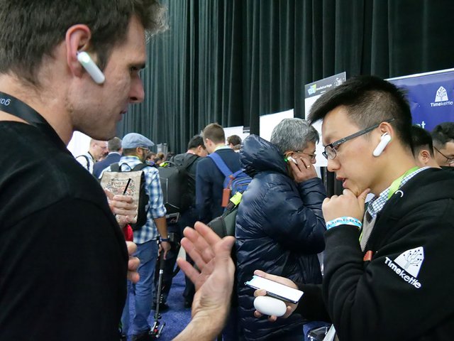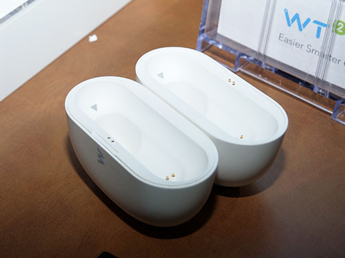 Timekettleは、リアルタイムで多言語を相互翻訳するイヤホン「WT2」を展示していた。以前からクラウドファンディングや各種デモで登場しているものだが、完全ワイヤレスイヤホンのように左右が分かれており、2人が片耳ずつを装着して会話するのが特徴だ。通信は、あいだにiPhoneなどスマートフォンが挟まり、片方が喋るといったんスマホに送られ、そこからクラウドを介して翻訳し、もう片方のイヤホンで翻訳された言葉が再生される仕組みだ。