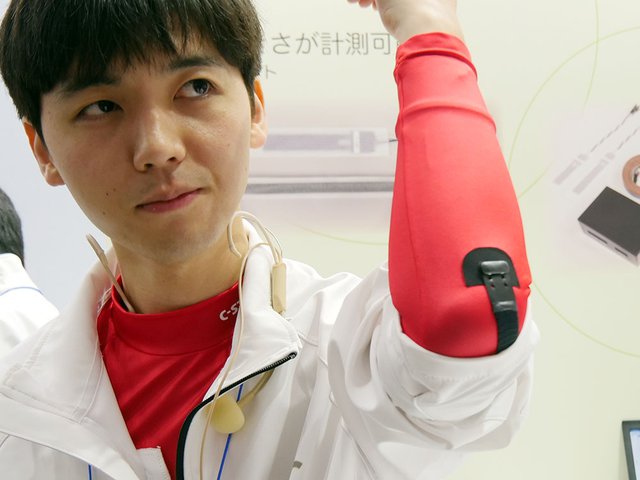 ブースでは、男性の肘や両脇、腰にC-STRETCHを貼り、その動きデータをWi-Fiでロボットに送信。人の動きのとおりにロボットを動かす、というデモを行っていた。男性が肘を伸ばすしたり、腰をひねったりするとロボットもそれに追随する様子が可愛らしく、来場者から喝采を浴びていた。