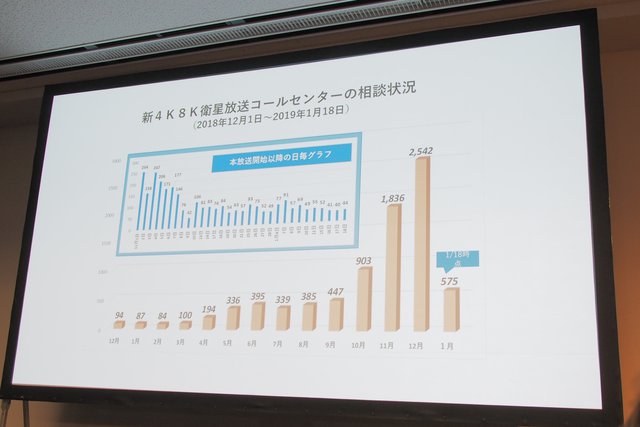 宇佐美氏は、新4K8K衛星放送コールセンターに寄せられる相談件数を報告。昨年8月までは400件以下だったものの、9月で447件、10月で903件、11月で1,836件と放送開始が近づくにつれて増加。12月には最多の2,542件を記録した。