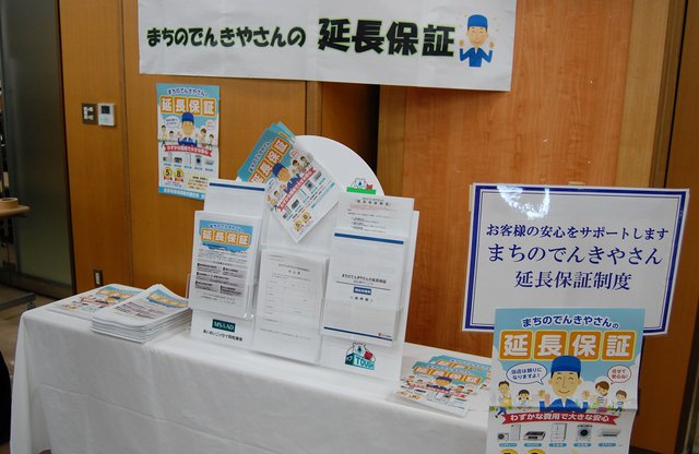入り口横では、組合から斡旋している「まちのでんきやさん延長保証制度」が初出展。これまでは資料やパンフレットなど紙ベースでの説明にとどまっていたが、説明員が付いて、来場した組合員からの疑問や質問に直接受け答えをすることで、関心・興味を深め、大きな手応えを得た。