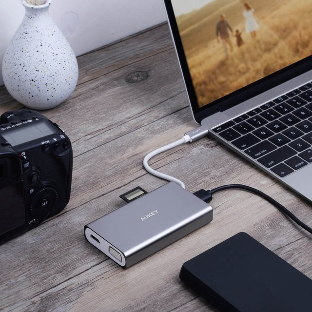 USB Type-C×1 USB 3.0×2 HDMI×1 VGA×1 SDカードスロット×1 microSDカードスロット×1 LAN端子×1 を備えたマルチハブ。USB PDのパススルー出力にも対応しており、MacBookやPD対応のノートパソコンへ100Wまでの給電を行いながら、 その他のUSB端子やHDMI端子なども使用できる。