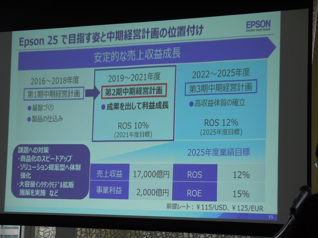 そして、第2期中期経営計画の初年度となる2019年度に向けた抱負が語られた。碓井氏は「外部環境は厳しく、中国経済が想定以上に減速、新興国での通貨下落や停滞が継続。先進国で競合によるインクカートリッジモデルの価格攻勢も続く」と直近の課題を認識。第2期は、「成果を出して利益成長を実現する3年間」と位置付ける。「品質、性能、納期、コストにも優れた製品、サービスによってイノベーションを加速させ、人やモノと情報がつながる新しい時代を創造するといった方向性に変更はないが、環境変化に俊敏に対応し、目標達成のための活動を推進する」とした。