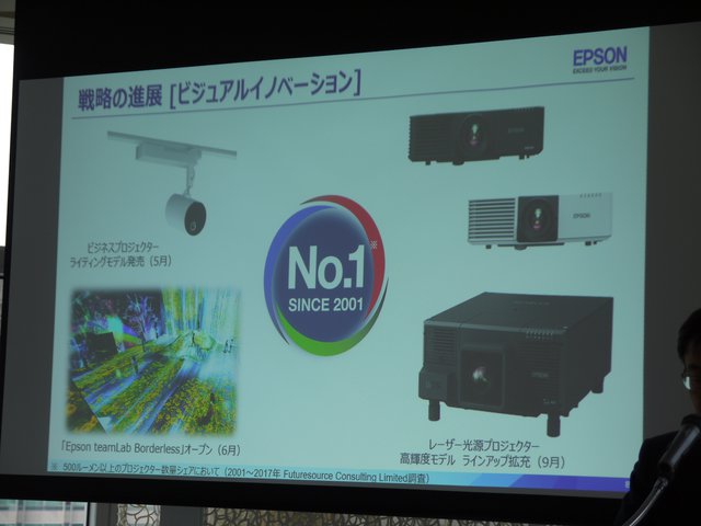 「ビジュアルイノベーション」では、昨年スポットライトとしても活用できるライティングモデルのプロジェクターを発売し、テーマパークやレストランでも導入された。レーザー光源搭載プロジェクターのラインナップ強化を実施、特に高光速プロジェクターのラインナップを拡充した結果、明るさ10,000ルーメン以上の分野でもシェアを伸長。またテクノロジスト集団であるチームラボとのコラボによるデジタルアートミュージアム「Epson teamLab Borderless」を昨年6月オープン、プロジェクターの新規市場の開拓を進めている。