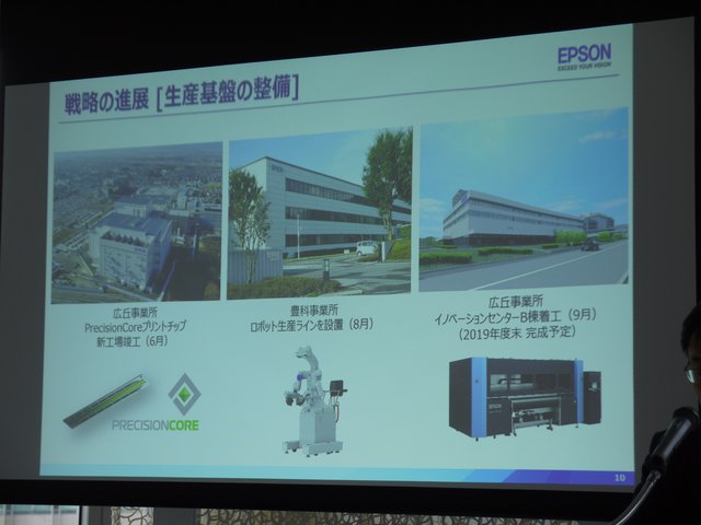 エプソンは、省・小・精の価値を実現するものづくりの力、グローバルに展開する販売のネットワークという強みを生かし、リアルなものづくり企業として、「インクジェット」「ビジュアル」「ウェアラブル」「ロボティクス」の4領域でイノベーションを起こし、価値ある商品やサービスをお届けすることを目指している。2016年度から始まった「Epson 25」の第1期中期経営計画の最終年度である当2018年度が終了目前となった今、これら4領域での取り組みが紹介された。