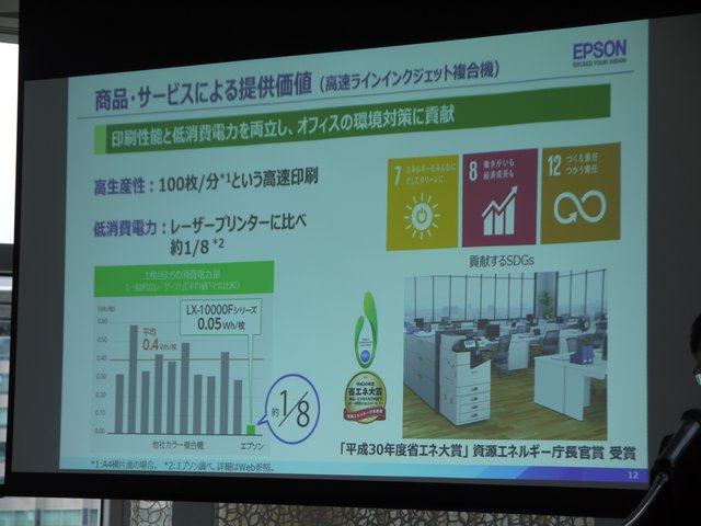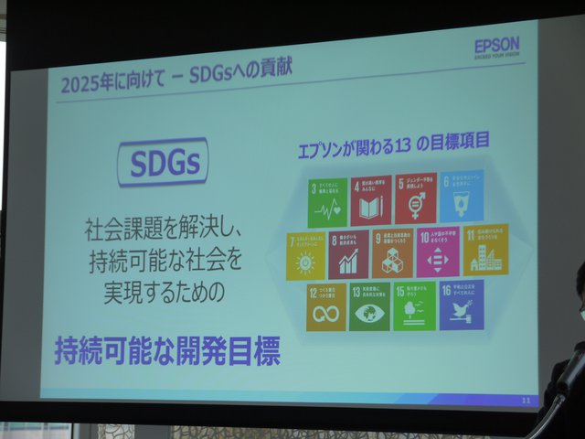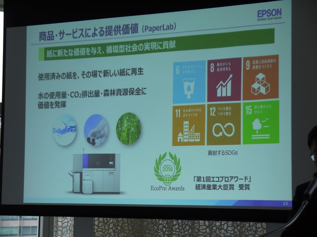 また2025年に向けた「SDGs」への貢献についても紹介された。2015年に国連本部で採択された「SDGs」は、社会課題の解決に向け持続可能な社会を実現するための持続可能な開発目標。そこで掲げられた17の目標項目のうち、エプソンは13項目に関わっているという。オフィスの環境対策に貢献した高速ラインインクジェット複合機、紙に新たな価値を与え循環型社会の実現に貢献した乾式オフィス製紙機「PaperLab(ペーパーラボ)」が事例として掲げられた。
