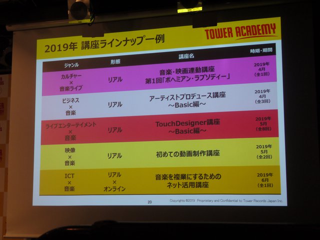 タワーレコード(株)は、上陸40周年の節目を迎える2019年に新規事業として、5G時代の音楽エンタメ人材を育成する「TOWER ACADEMY(タワーアカデミー)」を開校する。