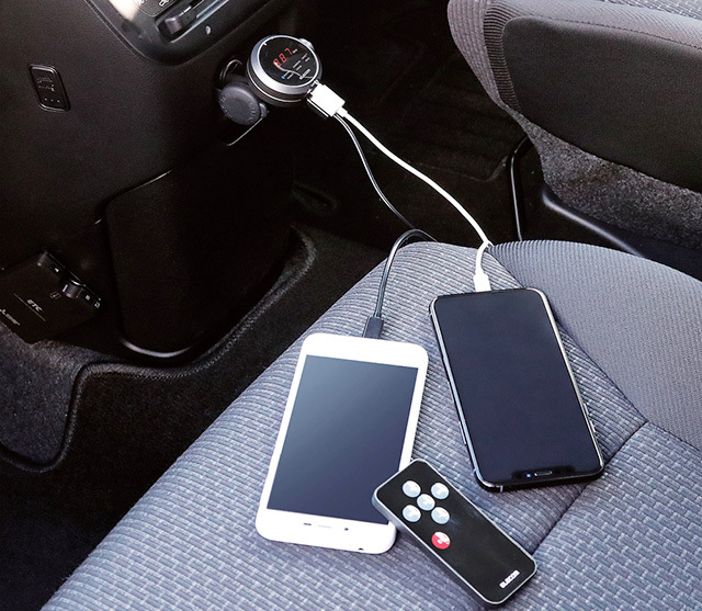 その他、最大2.4Aまで出力可能な充電用USBポートを2基搭載し、内蔵ICにより接続した機器に応じて出力を最適に調整する「おまかせ充電」機能にも対応。本体角度を調整できる首振り機構により、シガーソケット周辺と干渉せず使用できる。