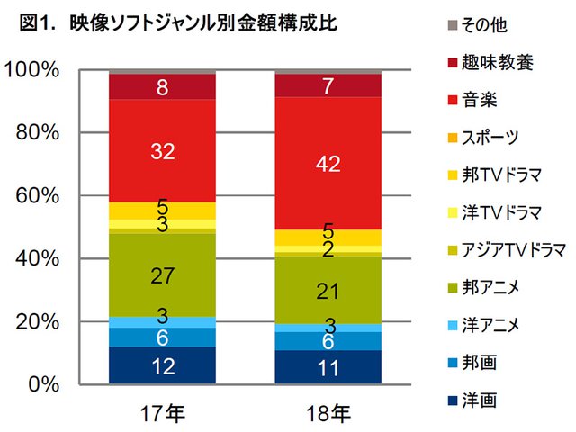 ジャンル別の金額構成比では、安室奈美恵作品等で盛り上がった音楽が前年から10%ポイント伸長し、42%となった。その一方で、前年「君の名は。」が注目を集めた邦アニメは6%ポイント縮小した。そのほか、洋画、洋TVドラマ、趣味教養が各1%ポイント縮小した。