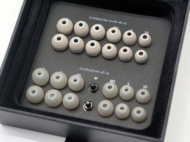 イヤーピースは、2種類の硬度のシリコンゴムに独自開発のシリコンフォーム素材を組み合わせたトリプルコンフォートイヤーピースを付属。トリプルコンフォートイヤピース6サイズ(SS/S/MS/M/ML/L)と、ハイブリッドイヤーピース7サイズ(SS/S/MS/M/ML/L/LL)の合計13種類が付属する。