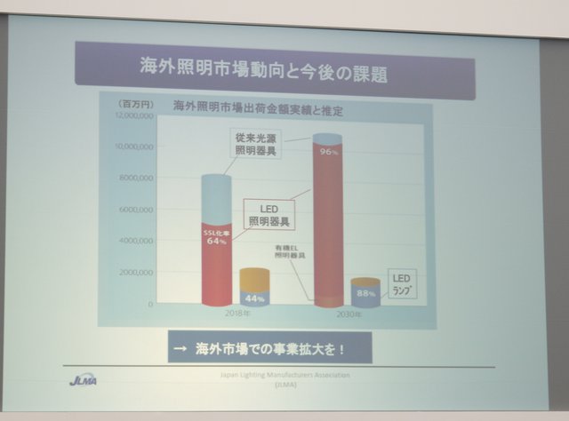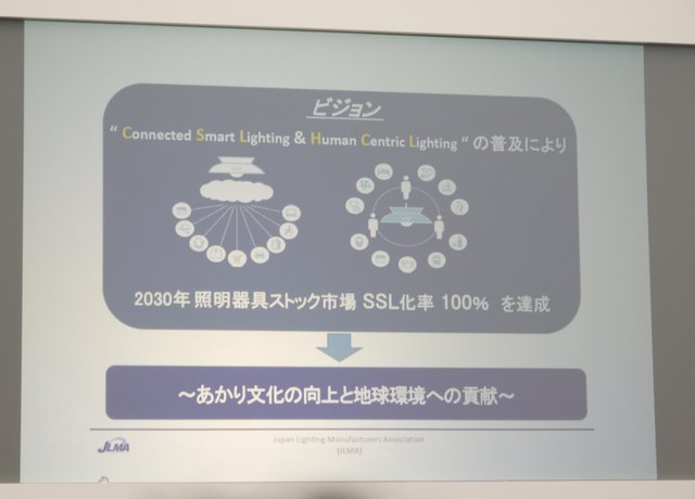 2030年度までのSSL化へ、LED以外の従来光源の照明器具が減じていき、LED照明器具が伸長すると予測。これまでの「Lighting Vision 2020」で掲げられていた2020年時点でのLED化率50%目標については「ほぼほぼ達成の見込み」とし、「2030年度LED化率は少なくとも98%にもっていきたい。ただ使用時間が非常に少ない部位に使われている器具やランプは、2030年時点でも既存光源が使用されつづけるだろう。しかし放置するつもりはなく、業界挙げて古い照明器具の取替え促進のキャンペーンを進めたい」と語った。2025年頃からはLED照明器具からLED照明器具への更新需要が見込まれている。またLEDランプを使用してのLED照明器具化も一定の需要を見込む。