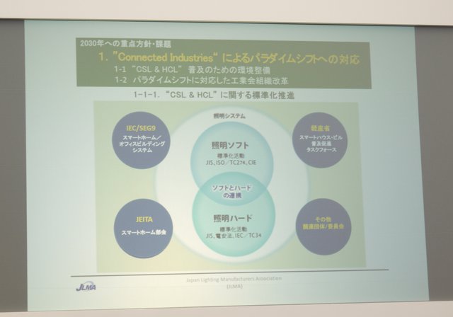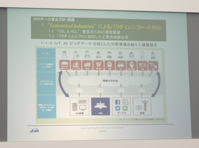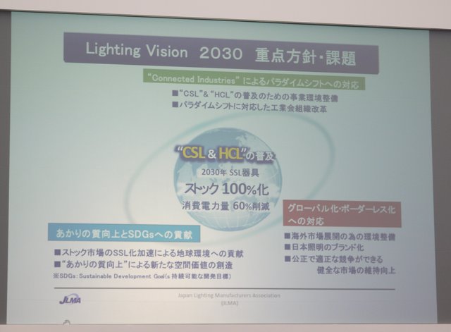 「Lighting Vision 2030」が掲げるビジョンは、「 “Connected Smart Lighting & Human Centric Lighting” (CSL&HCL)の普及により、2030年に照明器具ストック市場 SSL(LEDやOLEDなど次世代半導体照明)化率100%を達成する」、さらに「あかり文化の向上と地球環境への貢献」というもの。道浦氏は「Connected Smart LightingとHuman Centric Lightingは互いに連動したものであり、今後CSL&HCLをひとつのフレーズとして工業会活動のキーワードにする」と語る。