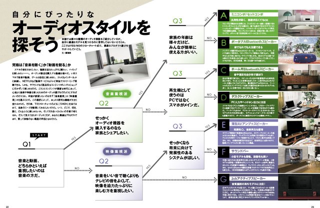 さらに今号では、自分に最適なプロダクトがわかるYES/NOチャートを準備しました。いつ、どこで、だれと、何を楽しむのか。そうしたことを想定した簡単な質問に答えれば、自分に最適な音楽の聴き方がみえてきます。機器選びの際に参考になれば幸いです。