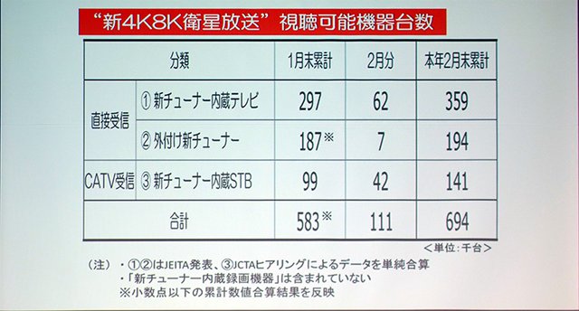 ただし、例えば4Kチューナー内蔵テレビであれば、1月末までの累計が29万7,000台だったところ、2月は6万2,000台と数値が落ち込んだ。「12月の放送開始前後は非常によく売れて、家電店から在庫がなくなるほどだった。しかし1月下旬から2月にかけては少し足踏み状態になっている」とした。