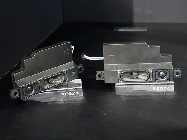 音声面では前述のように「レグザ重低音バズーカオーディオシステムPRO」を搭載。新開発の13mmシルクドームトゥイーターとフルレンジスピーカーを配置した大型バスレフ2ウェイスピーカーをフロントに搭載するとともに、ダブルウーファーと4個のパッシブラジエーターを採用した新開発の「重低音バズーカウーファー」を採用している。総合出力80Wのマルチアンプ駆動によって、リアルなサウンドと重低音を再現するとしている。