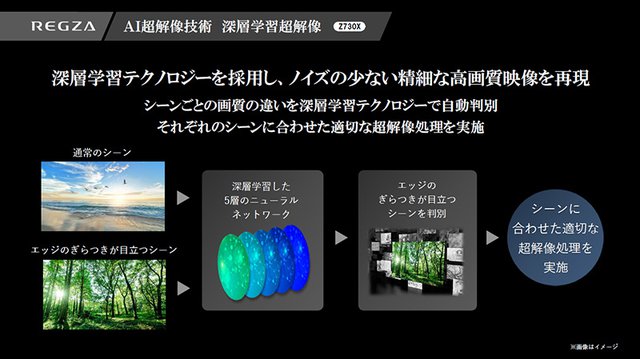 「深層学習超解像」では、5層のニューラルネットワークで映像の精細さを深層学習した結果をもとに、通常のシーンとエッジのぎらつきが目立つシーンを自動判別し、適切な超解像処理をすることでノイズの少ないきめ細やかな映像再現を行うという。