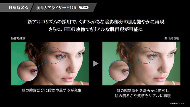 また、人物の肌をリアルに描写する機能「美肌リアライザー」も、新たにHDR映像にも対応した「美肌リアライザーHDR」へと進化させた。新アルゴリズムの採用によって、くすみがちな陰影部分の肌も艶やかに再現するよう配慮した。