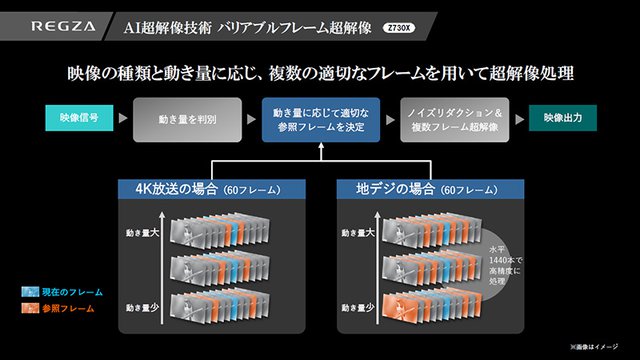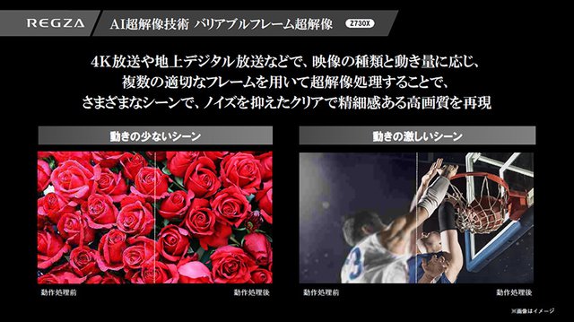 「バリアブルフレーム超解像」は、超解像処理の際に参照する前後のフレームを、コンテンツの内容によって変えるというもの。動きの激しい映像では近いフレームを、動きの少ない映像では遠目のフレームを参照するなどといったように、映像の種類と動き量に応じて複数のフレームを用いて超解像処理を行う。これにより、様々なシーンでノイズを抑えてクリアで精細感のある高画質映像を再現するとしている。