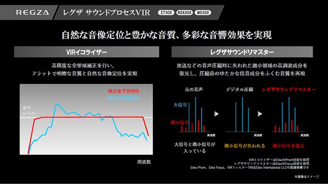 「レグザサウンドプロセスVIR」は、Eilex社のPrism技術を採用した「VIRイコライザー」と、同じくEilex社のFocus技術を採用した「レグザサウンドリマスター」という2機能から成る機能。「VIRイコライザー」が高精度な全帯域補正を行うことでフラットで明瞭な音質と自然な音像定位を実現し、「レグザサウンドリマスター」によって放送などの音声圧縮時に失われた微小信号を復元することで、圧縮前の倍音成分を含む音質の再現を図っている。
