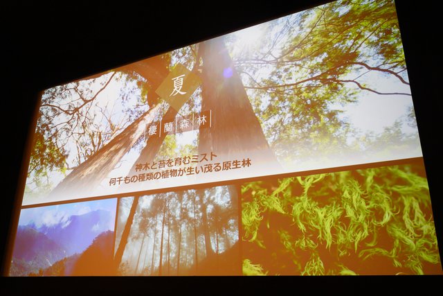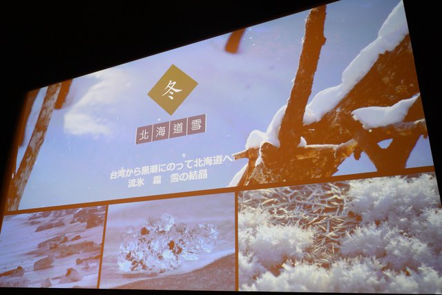 映像は四季に分けて構成されており、夏は様々な植物が生い茂る原生林、秋は干し柿を作る過程、冬は雪や台湾から黒潮に乗って北海道へたどり着く氷、春は桜が有名な日月潭という湖にフォーカス。水を巡るサイクルで循環している様子がわかると説明する。