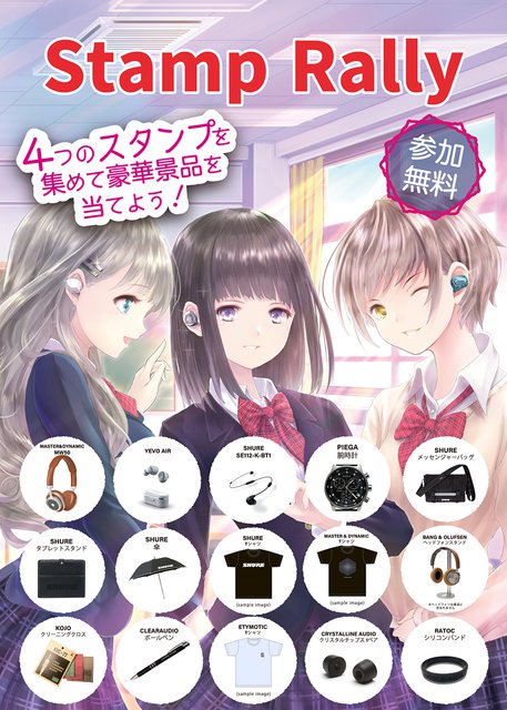 完実電気ブースでは、製品展示に加えて、いろいろな景品がゲットできる企画を実施。ブースで試聴しスタンプ4つを集めることでMASTER&DYNAMIC「MW50」やYEVO「AIR」、シュアTシャツにシュア傘などがもらえるスタンプラリーを展開。さらに、愛用のETYMOTICの写真と「#ETYMOTIC」「#ヘッドフォン祭」のハッシュタグをつけてSNSに投稿、もしくは「#クリスタルチップス」「#ヘッドフォン祭」のハッシュタグつきで投稿することで、先着でオリジナルTシャツや「Mコア・Mサイズ(1ペア)」がもらえる。なお、すべて景品がなくなり次第終了となる。
