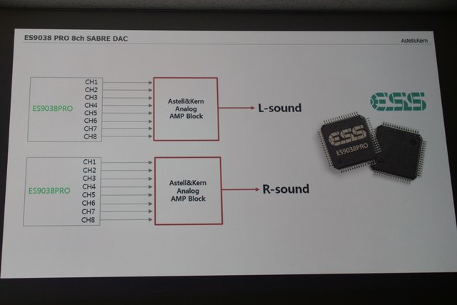 ポータビリティを犠牲にしたとも言える大型ボディを採用した理由は、ESS Technologyの最上位となる8ch DAC「ES9038PRO」のデュアル搭載を実現するためだったという。ES9038PROはホームオーディオ向けのDACチップであり、もともとポータブル用途は想定されていないという。Astell&Kernは昨年2018年発売の「SE100」でポータブルプレーヤーとして世界初のES9038PROの搭載を実現させたが、ES9038PROのデュアル搭載はやはりポータブルプレーヤーとしてKANN CUBEが世界初とのこと。なお、従来のKANNはAKM製DAC「AK4490」を1基搭載という仕様だった。