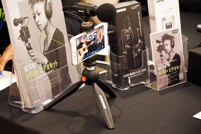 注目したいのは、SHUREが力を入れているマイクセット「MV88+ ビデオキット」だ。スマートフォンと接続して使用するポータブルマイクとビデオアクセサリーをセットにしたモデルだ。Manfrotto PIXIミニ三脚 、クランプ& シューマウント、USB Type-CおよびLightningコネクタ用ケーブルに加え、ロールアップ式ツールバッグも付属している。