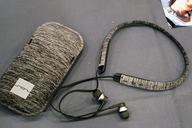 同社が扱うブランド群がずらりと並ぶ中、最も注目なのがSOL REPUBLICの「SHADOWS FUSION」だ。すでに当サイトでもレビュー記事を掲載しているが、ネックバンドスタイルのワイヤレスイヤホンで、素材にフレックニット・ファブリック素材、いわゆるニット生地が使われており、とても肌触りがよい。