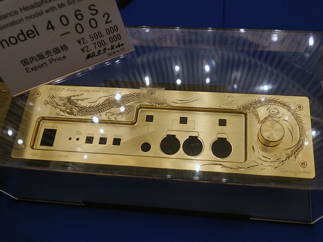 マス工房は、フルバランスのヘッドホンアンプ「model406」などを展示。そのフロントパネルに飛龍の彫刻、およびボリュームツマミにダイヤモンドを埋め込んで純金メッキ仕上げを施した特別モデル「model406S-002」の展示も行っている。