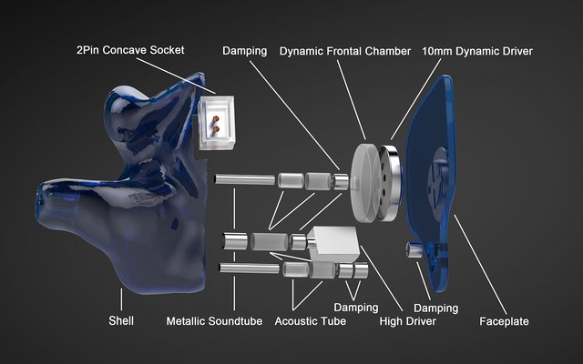 ドライバーは低域を受け持つダイナミックドライバー1基、中/高域を受け持つBAドライバー1基の2ドライバー・ハイブリッド構成。クロスオーバーは2 ウェイ・クロスオーバーで、周波数特性は20Hz - 20kHz。入力感度は98dB、インピーダンスは12Ωとなる。