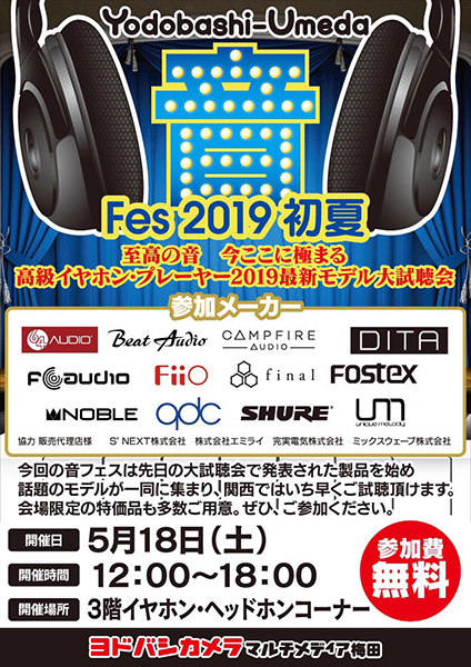 ヨドバシカメラ梅田店 3階オーディオコーナーにて、ポータブルオーディオ試聴イベント「音フェス 2019初夏」が5月18日(土)12:00 - 18:00に開催される。
