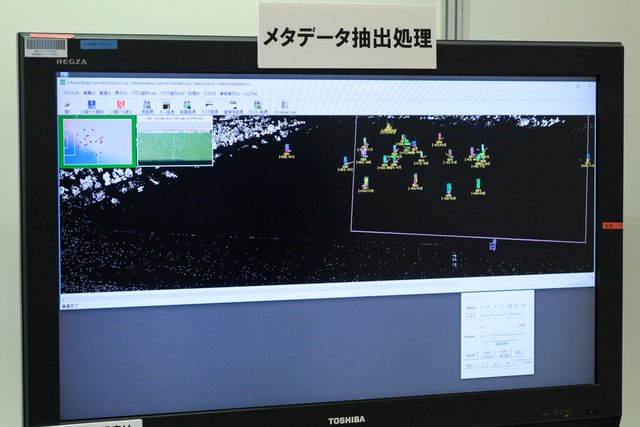 関連した技術として、「スポーツ映像の状況理解技術」というブースでは、AIを搭載したロボットカメラを展示。サッカーにおいて、選手の方向やボールの位置をAIが状況理解することで、カメラワークを自動的に調整できる。またこのAIで生成したメタデータでセンシングを行い、3Dデータを作成することで、自由な視点から見ることのできるVR映像や、左目に3D・右目に実写の2D映像を流すことで3D映像も作れるという。