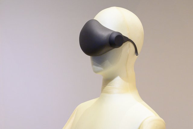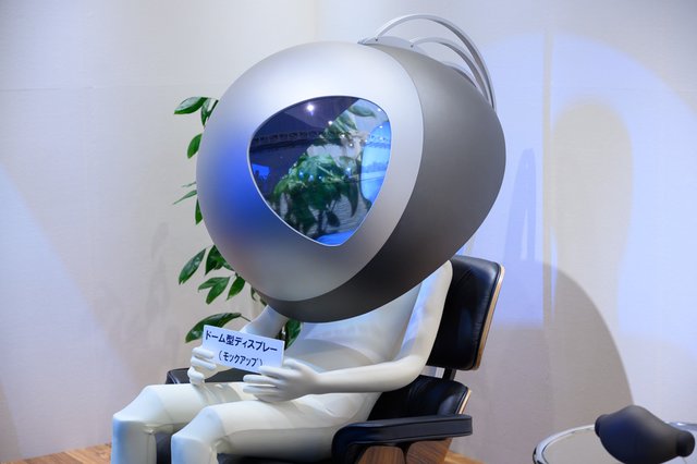 まず目に入るのが、ヘッドマウントディスプレイとドーム型ディスプレイのモックアップ展示。将来的には、高精細なVR映像をこれらのデバイスを使用して楽しむようになるのではないか、とNHKでは予測する。今回の技研公開では、多くの方がこのイメージを体感するため、高さ4m×開口11mで180度の円形スクリーンに映像が投影された。