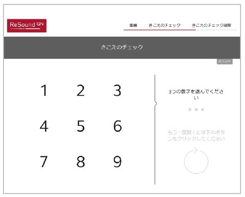 診断の所要時間は約3分。最初に性別や年齢、スピーカーとヘッドホンのどちらを使用するかを選択すると、雑音とともに単語、もしくは数字が3つ読み上げられるため、聞こえた単語を順番通りに選んでいくシステム。これが雑音の大きさが変わりながら数回繰り返されることで、自身の聴力の衰え具合を診断できるという。
