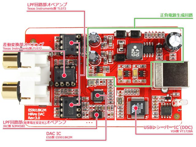 96kHz/24bit PCMのハイレゾ再生に対応。DAC ICにはESS Technology社製の「ES9018K2M」を採用し、またUSBレシーバーIC(DDC)にVIA社製「VT1728A」を採用する。USBバスパワー駆動となっており、パソコンとUSBケーブルで接続することで動作が可能。