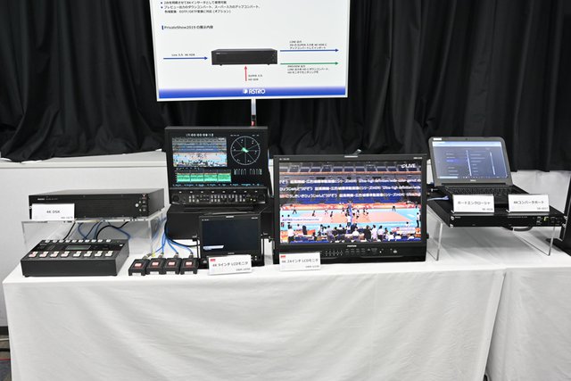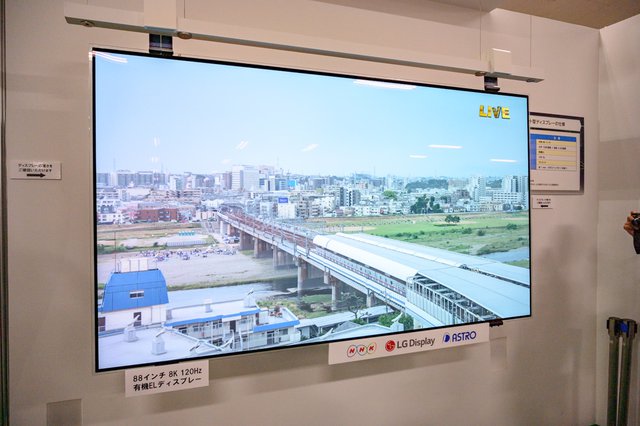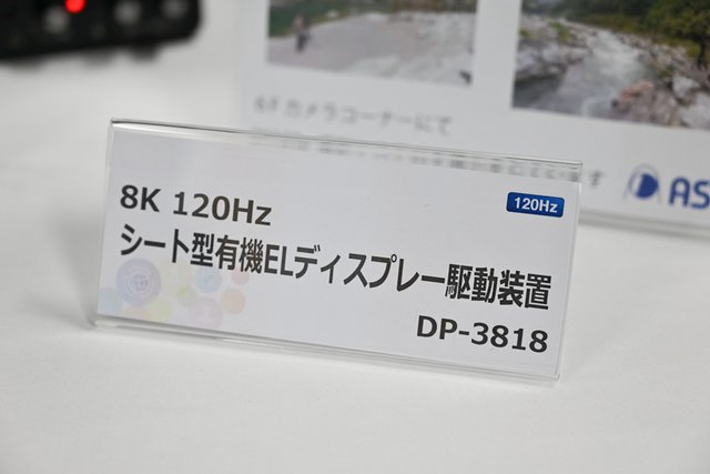 先日のNHK技研公開でも展示された、120p対応の8Kシート型有機ELディスプレイも本イベントで展示。残念ながら撮影禁止となっていたが、部屋の中央にアクリルに貼付けされたディスプレイが鎮座しており、その薄さが体感しやすい展示となっていた。こちらはNHK、LG、アストロデザインの共同開発品となっており、LGはパネルと液晶制御部を、アストロデザインは信号処理装置を手がけたとのこと。具体的には、U-SDIで入力された8K120pの信号を処理し、液晶パネルで表示できる形式にコンバートする役割を担っているという。