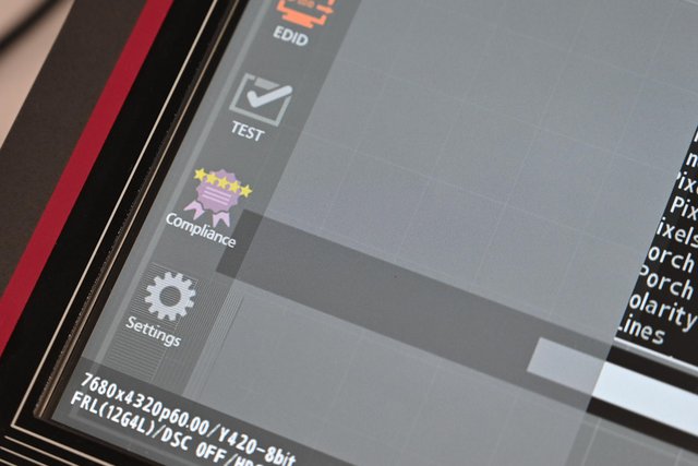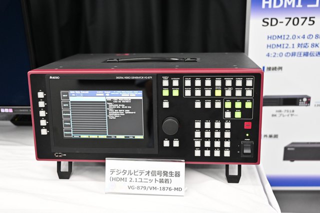 同社が今回展示したのは、主にテレビやケーブルが認証基準に満たしているかなど、テストできるもの。まずHDMI2.1対応のユニット「VM-1876-MD」は、従来より発売されていたデジタルビデオ発生機「VG-879」をHDMI2.1に対応させるもの。非圧縮8K60p(4:2:0)、4K120p(4:4:4)の出力に対応している。カラーバーやディスプレイの表示解像度をチェックするためのテスト映像/画像も出力できる。