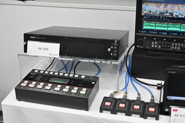 8K関連では、8K120Hzに対応したポータブルカメラ新製品「AB-4815」が展示。発表以来、問い合わせも多いとのことで、説明員に詳細を尋ねる方も多く見られた。会場ではこのカメラを同ビル上層階に設置して光伝送によってブースで表示させたり、8K480pの記録にも対応したビデオサーバー「SR-8428」で記録しながら、同社の8K120p対応55インチLCDモニタ「DM-3815」で表示させるなど、大きさを活かしたマルチな使い方をアピールしていた。