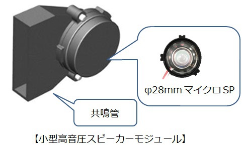 同社によると、振動板の振動モード解析などで振動板形状を検討し、ピークディップ周波数を最適に発生させることでドライバーユニットの高音圧化を実現。また振動板の前面に共鳴管を配置することにより、さらに音圧を上げることに成功。これにより、小型ながら1m離れた位置で95dBの音圧を実現するスピーカーモジュールを開発したとのこと。