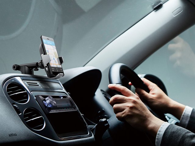 ワンタッチでスマートフォンを脱着できる、静電タッチセンサーと赤外線センサーを用いた電動オートホールドを搭載。さらに脱着時の落下を防ぐスリップ防止パッドと落下防止パーツを装備しているほか、外し忘れ対策として電気二重層キャパシターを搭載しており、降車時などスマートフォンをホールドしたままエンジンを切ってしまった後でも、ワンタッチでスマートフォンの取り外しが行える。
