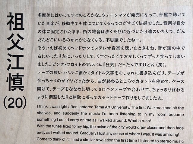 イベントのメインとなるのが、体験型展示の「My Story, My Walkman」。サカナクションの山口一郎さん、OKAMOTO'Sのオカモトレイジさん、砂原良徳さん、tofubeatsさんといったミュージシャンはもちろん、プロレスラーの棚橋弘至さん、俳優の荒川良々さん、ブックデザイナーの祖父江慎さんなど、1979年から現在に至るまでの様々な世代の著名人40名の思い出やエピソードとともに、当時の楽曲をその年代に発売されていたウォークマンで聴くことができる。