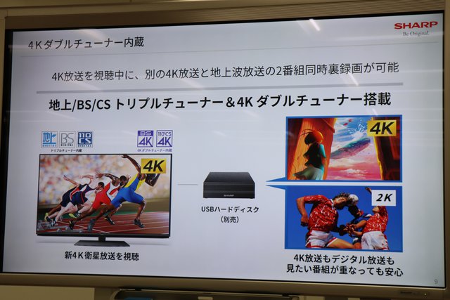 シャープは、新4K衛星放送と地上波放送の2番組同時裏録画に対応した4K液晶テレビ「AQUOS 4K」3シリーズ8機種を7月27日より発売する。