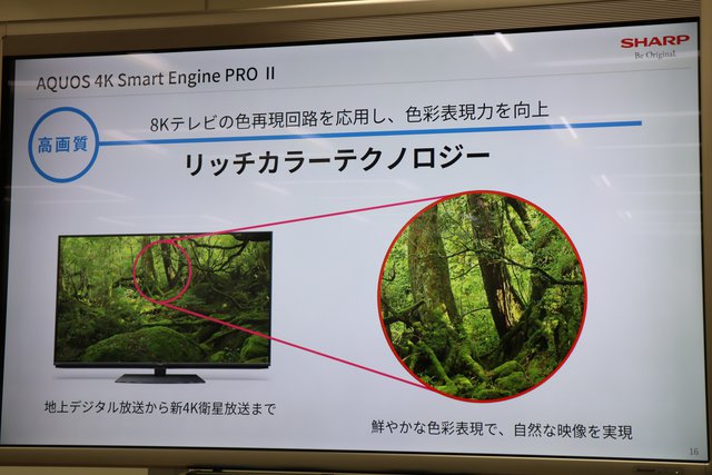 特筆すべきは同社の8Kテレビにおける色再現回路を応用して色彩表現力を向上させたという「リッチカラーテクノロジー」だ。これにより鮮やかな色彩再現が可能となり、自然な映像を実現できるとする。