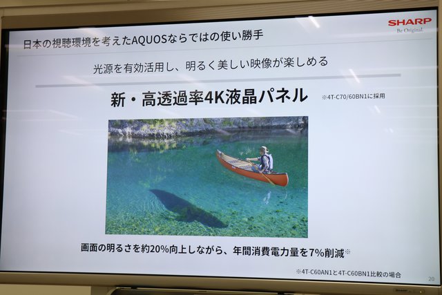 また、BN1シリーズのみ、外光の反射や照明の映り込みを抑えながら、艶やかな黒を表現する「N-Blackパネル」を搭載。さらに4T-C70BN1/4T-C60BN1の2機種は、新開発の高透過率4K液晶パネルを採用。従来機比で年間消費電力量を約7%低減しつつ、輝度を約20%向上させた。この新パネルにおける透過率向上は、ドライバーの小型化や配線を細くすることなどによって実現したとのこと。バックライトはそのままで輝度向上を実現させたため、消費電力の低減も同時に可能になったという。