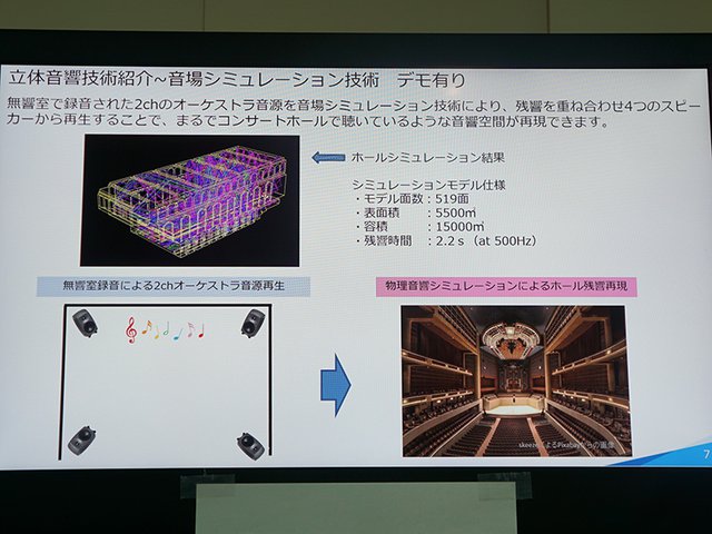例えば、上記のように無響室で録音された2chのオーケストラ音源に対して、音場シミュレーション技術によって残響を4つのスピーカーから再生。これにより、コンサートホールで聴いているような音場空間を再現する。図面を基にコンサートホールの響きを再現するデータを作成するため、会場の広さの違いなども表現できる。