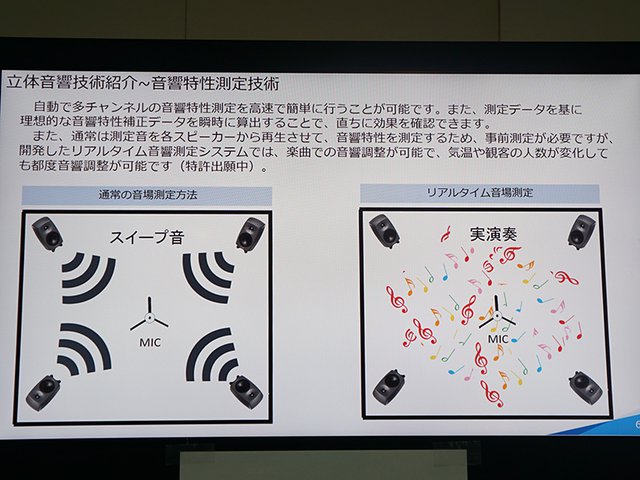 また、音場補正前の部屋の音響特性測定において、スイープ音を用いる一般的な方法ではなく、通常の楽器演奏などを用いることが可能な技術を持っているとも紹介。