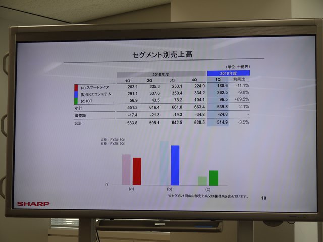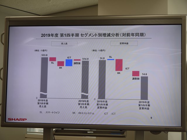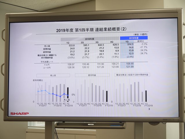 シャープは、2019年度第一四半期の決算概要を発表。同社代表取締役 兼 副社長執行役員 野村勝明氏が説明を行った。