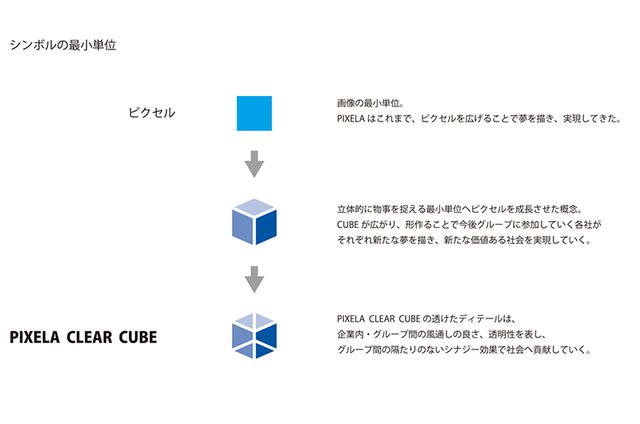 なお「PIXELA CLEAR CUBE」は立方体の中が透けた構造も図案化することで、各社内・グループ間の風通しの良さや透明性も表現したとしている。